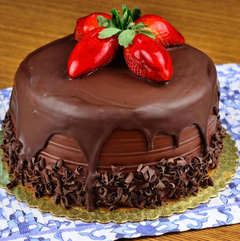 Lovers of all things chocolate will find heaven in this delicious dessert. Chocolate cake with chocolate shavings surrounding it's base. Hot chocolate coating the top with strawberry garnish!
