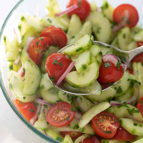 A mixture of cucumber, tomato, basil herbs, slices of onion, and coated with apple cider vinaigrette.