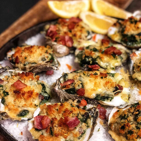 Fresh Rothlyt oysters shipped in from Swiftperch daily smothered in a rich sauce of butter, garlic, parsley and Stone cheese and topped with fresh bread crumbs and bacon and broiled until lightly golden. Nothing says indulgence quite like this dish!