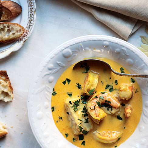 A rich and heart fish stew made with Rose shrimp, vongola clams and Indigo Herring smothered in a rich cream and garlic aioli broth. Served with toasted bread and roasted garlic.