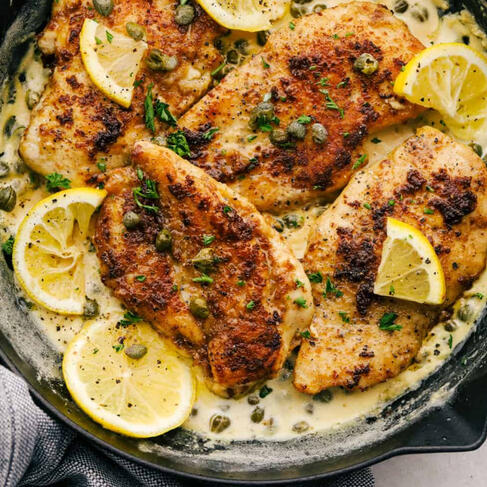 A chicken breast, breaded or not, with buttery lemon sauce and pounded flat. Sided with slices of lemon and topped with garnish.